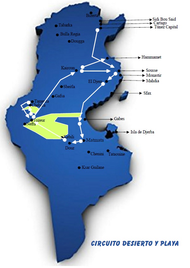 Salida hacia Tozeur, capital del "Jerid" (la tierra de las palmeras)atravesando del espectacular lago salado "Chott El Jerid", situado a 25 metros sobre el nivel del mar y conocido por sus espejismos. Parada paracontemplar el paisaje y los varios fenómenos naturales que se venúnicamente allí. Continuación hacia ‘’Tozeur’’.Tiempo libre en el centro de la ciudad y sus Zocos con posibilidad de realizar unaexcursión optativa en calesas (carros de caballos) para visitar el oasis de‘’Nefta’’ y descubrir la vida dentro de los palmerales. instalación en el hotel yalmuerzo.